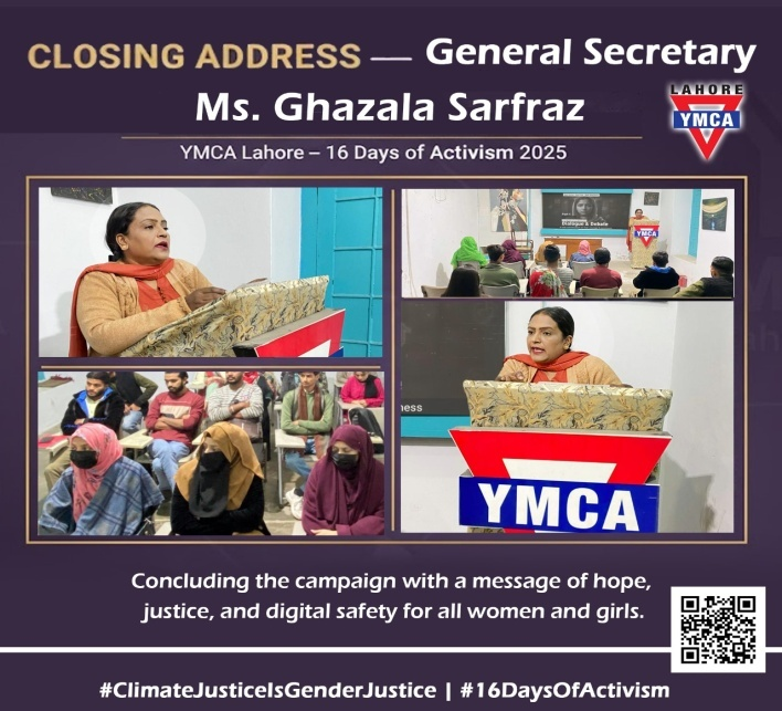On 4 December, Madam Ghazala Sarfraz General Secretary of YMCA Lahore delivered a powerful message emphasizing justice, dignity, and standing with survivors of gender-based violence.