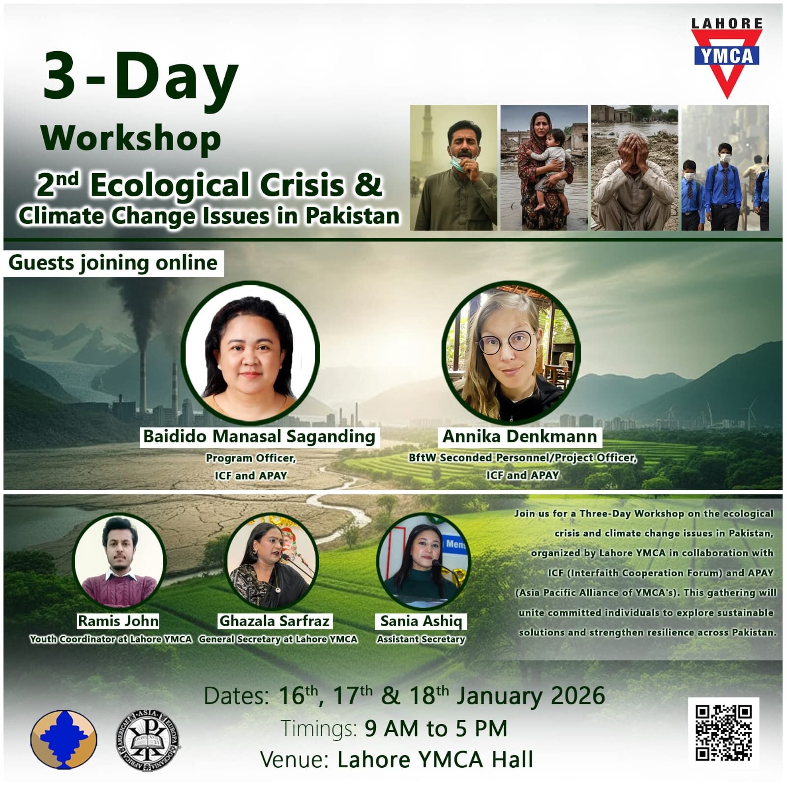 The Three Day 2nd Workshop on Ecological Crisis and Climate Change Issues in Pakistan was conducted from January 16 to 18, 2026, at the YMCA Hall in Lahore, Pakistan. The workshop was organized by Lahore YMCA, in collaboration with the Interfaith Cooperation Forum (ICF) and the Asia Pacific Alliance of YMCAs (APAY).